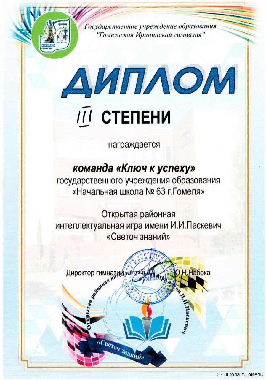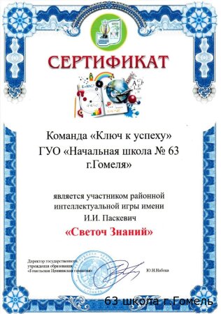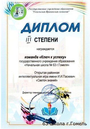 👨🎓Команда ГУО "Начальная школа №63г. Гомеля" не только приняли участие в конкурсе, призванном раскрыть интеллектуальный и творческий потенциал младших школьников Новобелицкого района, а показали свои 💡знаниями по итогам всех испытаний была удостоена Диплома 3 степени. Особо были отмечены успехи ребят в творческом конкурсе и награждены ✔️сертификатом за блестящее выступление в театральной постановке.