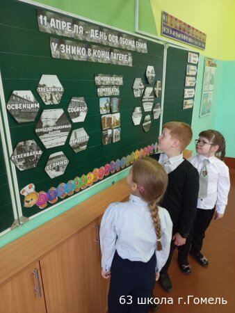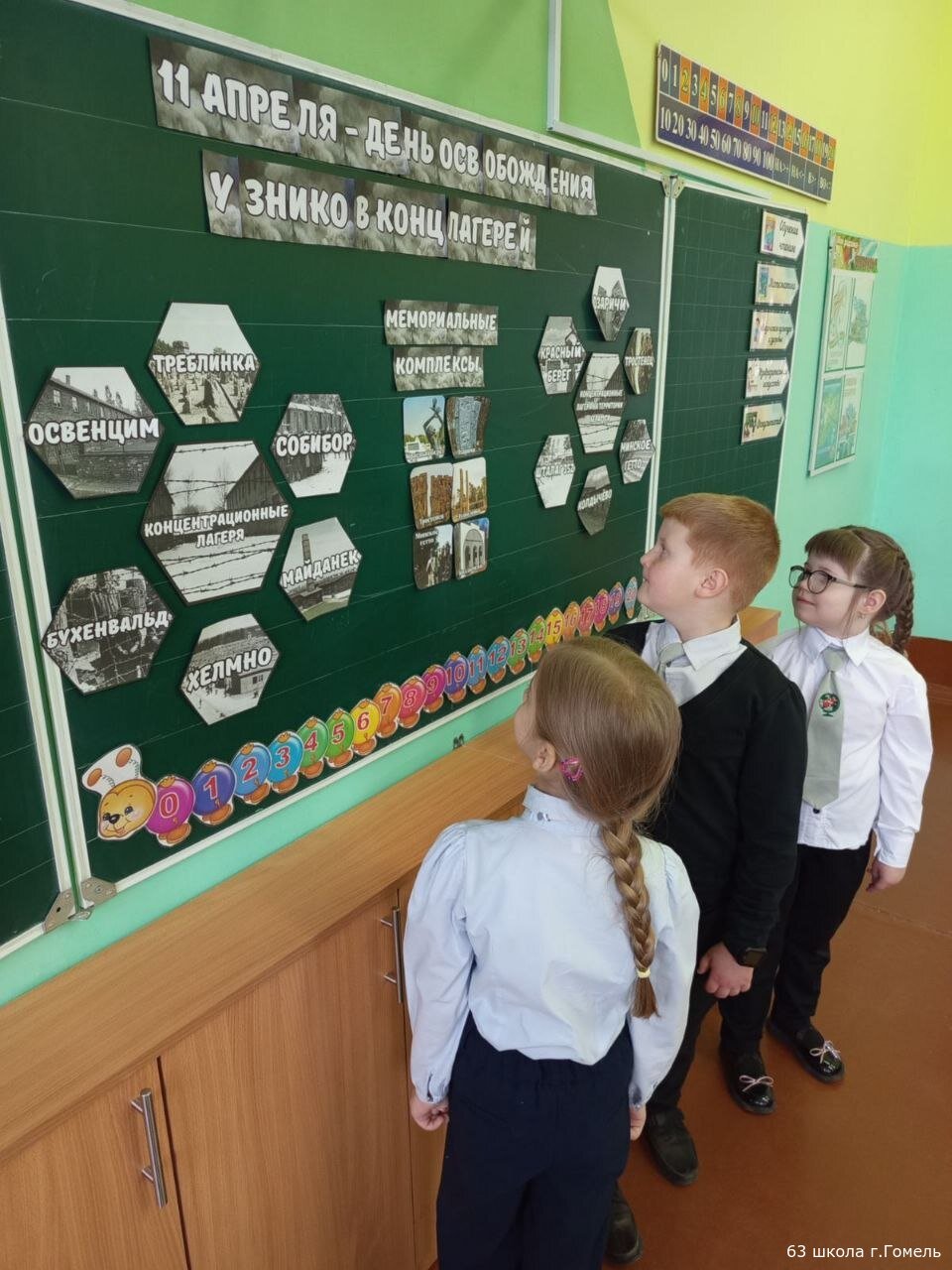 В ГУО "Начальная школа 63 г.Гомеля" прошли информационные часы, посвященные Международному дню освобождения узников фашистских концлагерей. Миллионы людей – стариков, женщин, детей – были обречены на голод, непосильный труд, медицинские эксперименты и газовые камеры. Осознанный долг каждого из нас – чтить память о них и сделать все возможное, чтобы не допустить повторения подобных преступлений против человечества.